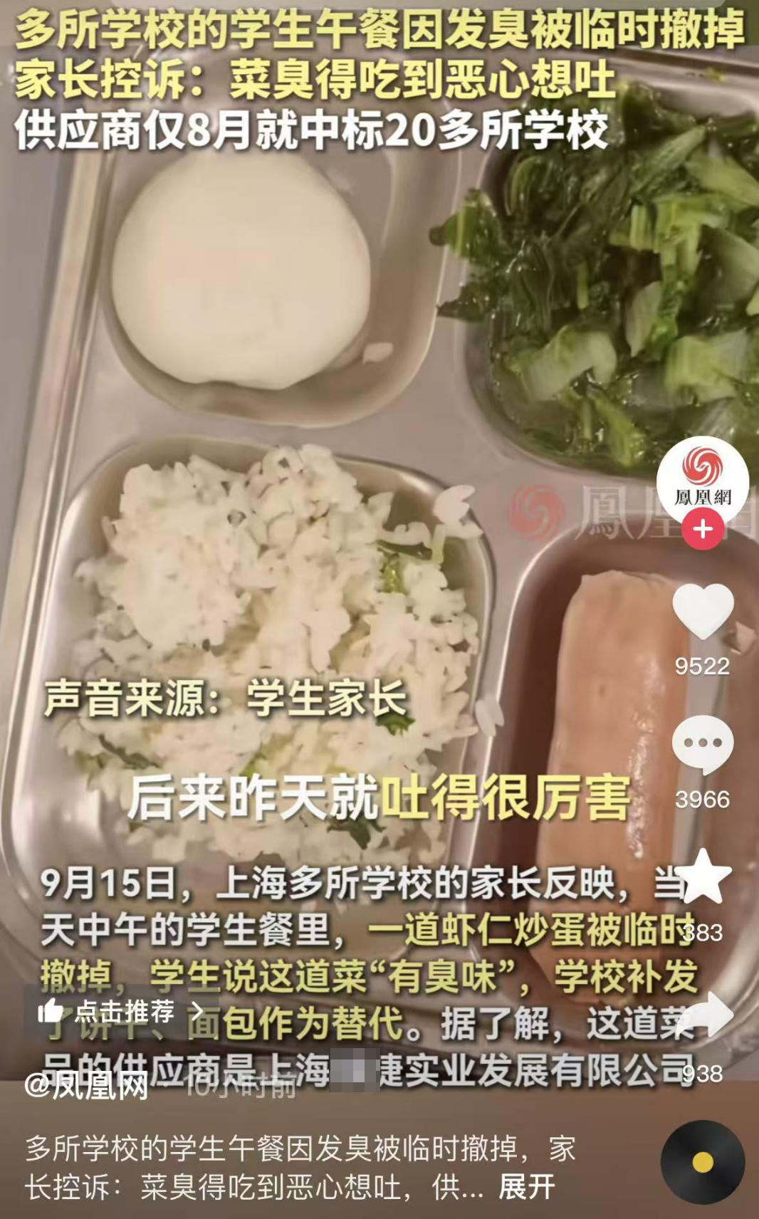 15号,多个家长反映,上海多所学校学生餐里的虾仁炒蛋出现食物发臭的情况。