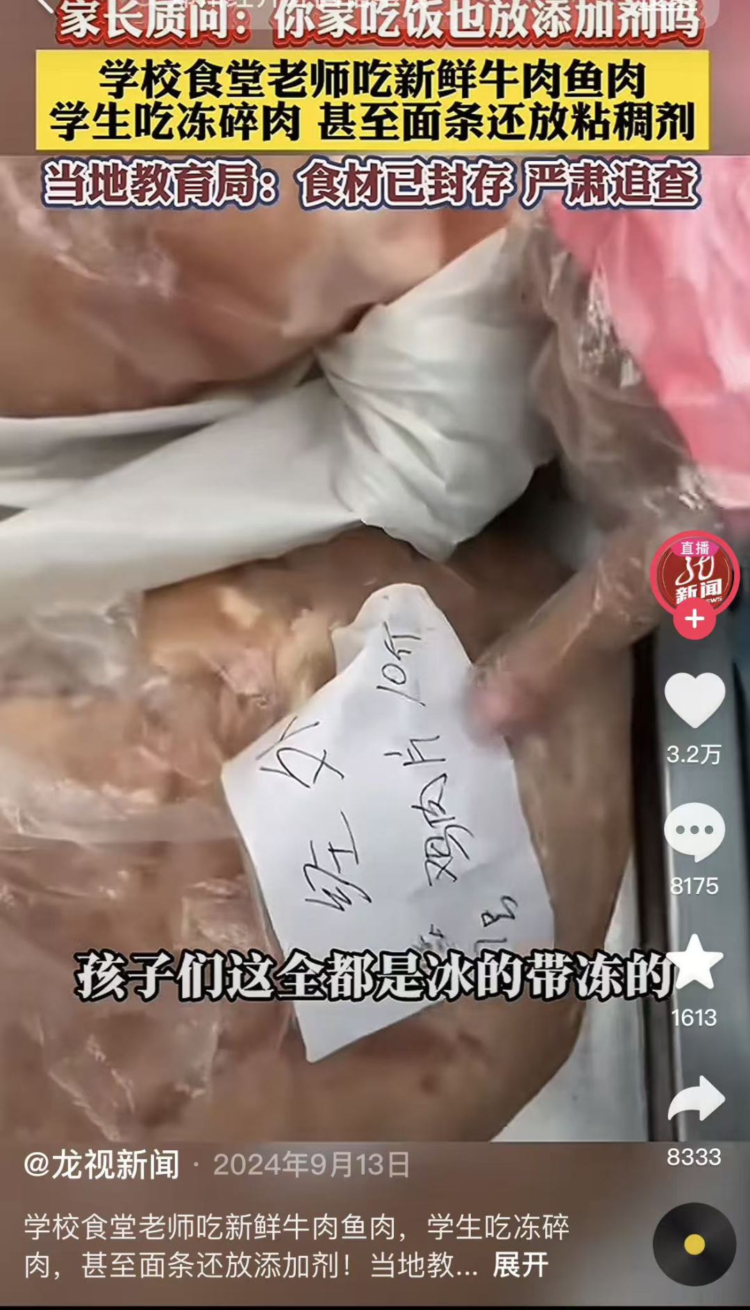 还有的学校,老师吃新鲜饭菜,给孩子吃的却都是冻肉。